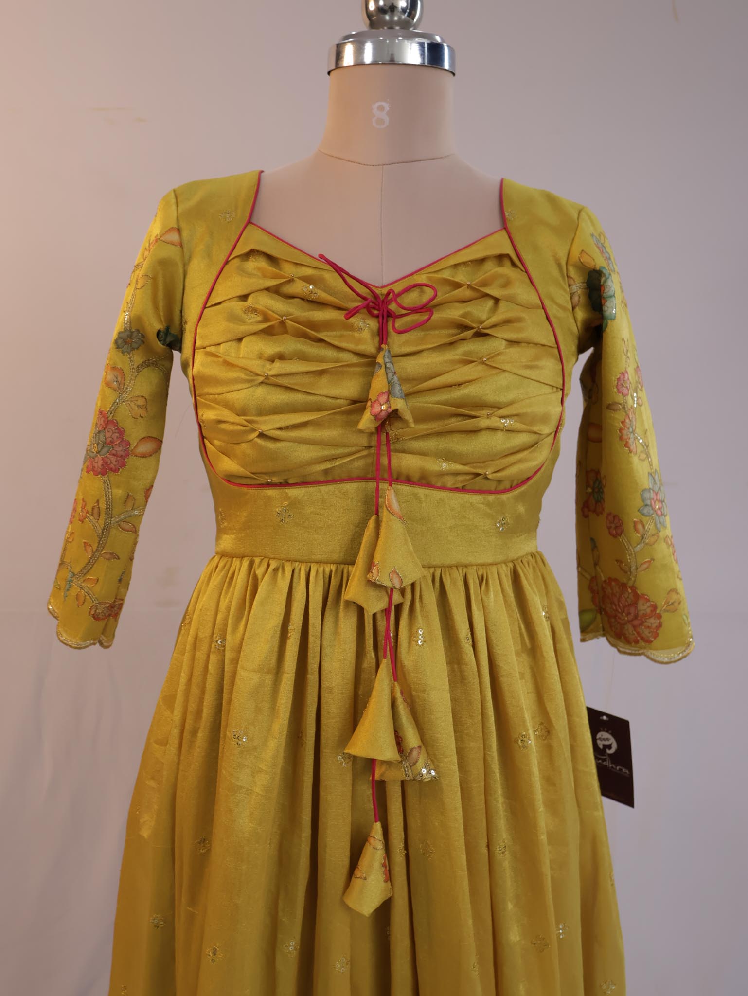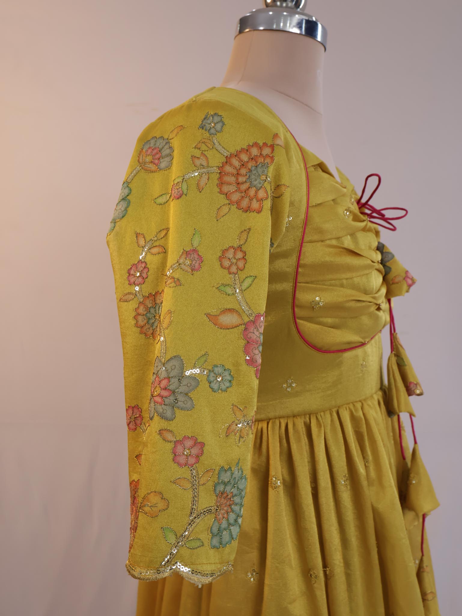 Celebrate every special occasion in style with this elegant mustard gold ethnic dress. Designed with soft gathers, delicate floral sleeves, and charming tie-up tassel details on the bodice, this outfit blends traditional beauty with modern comfort.