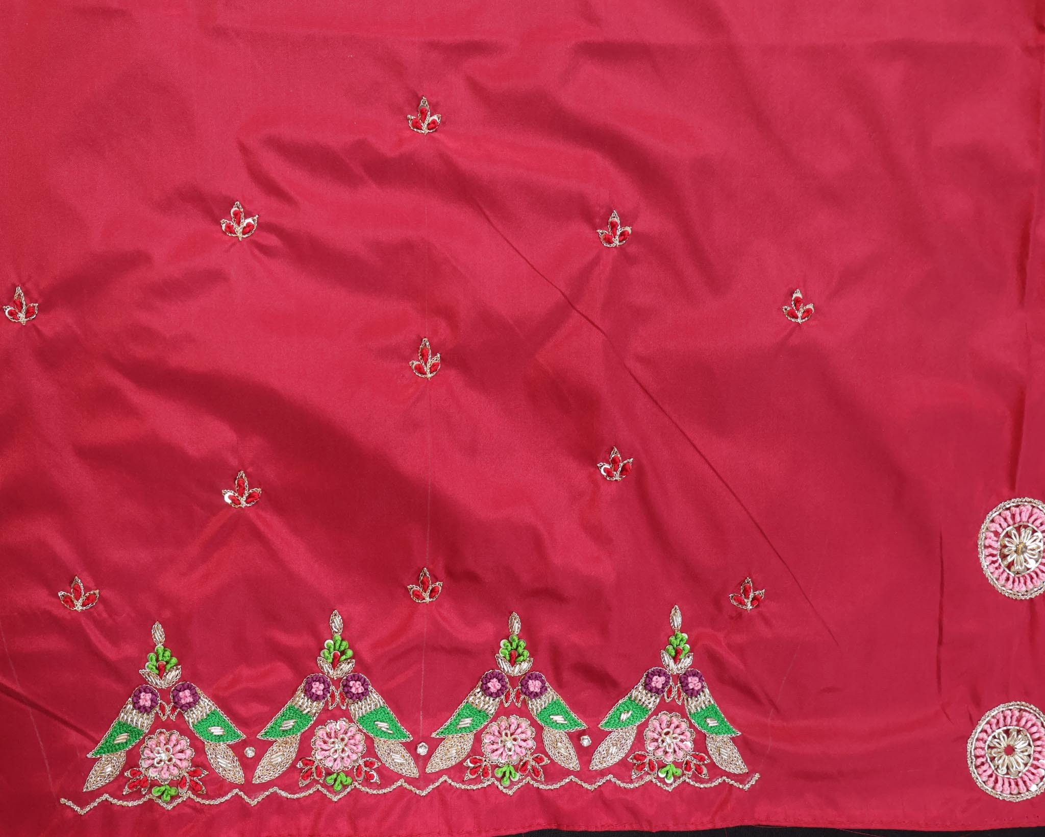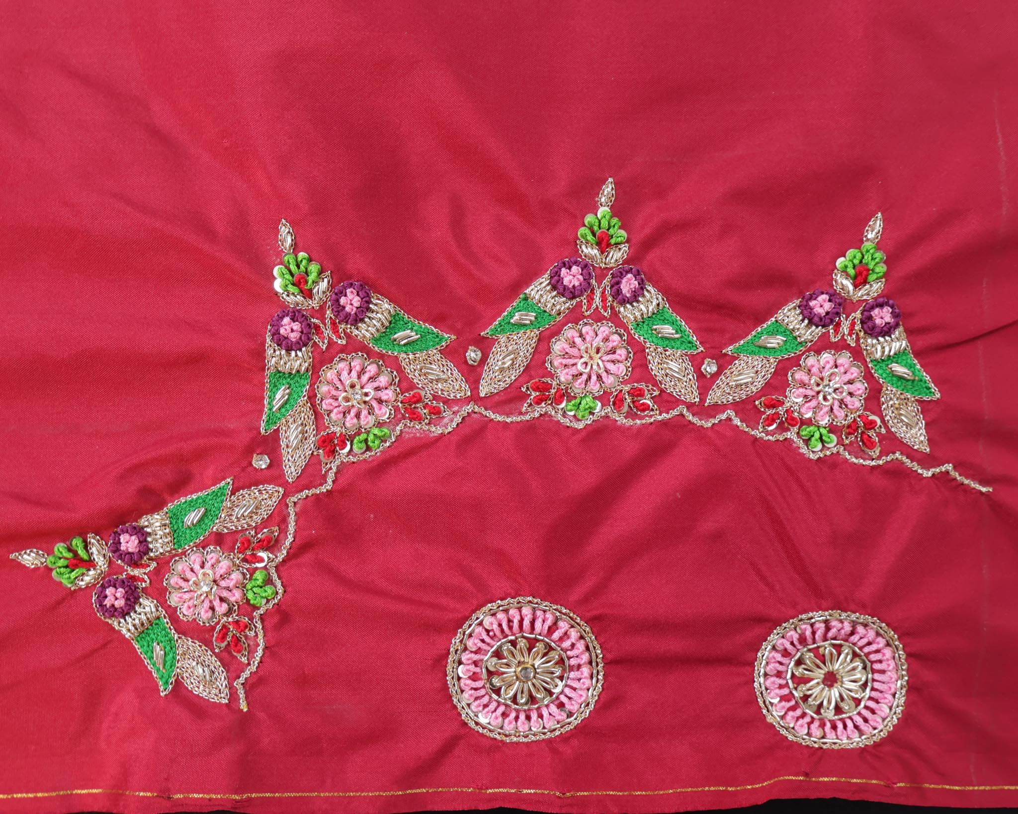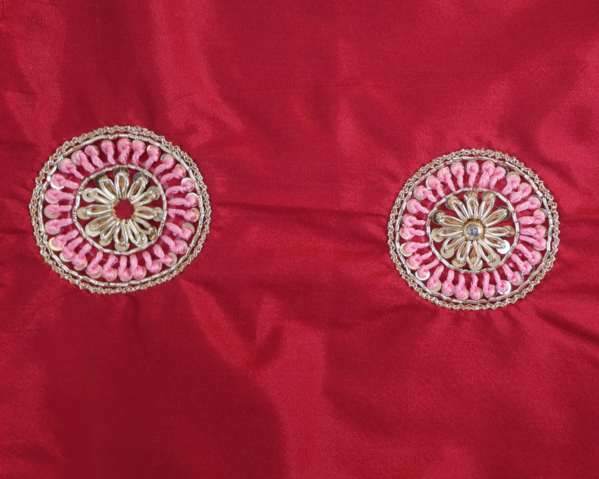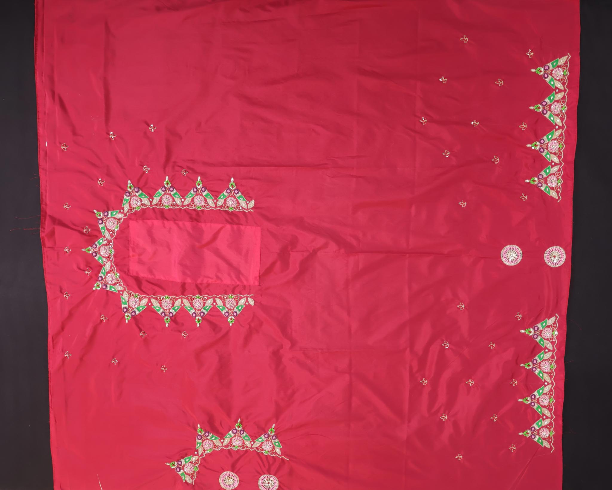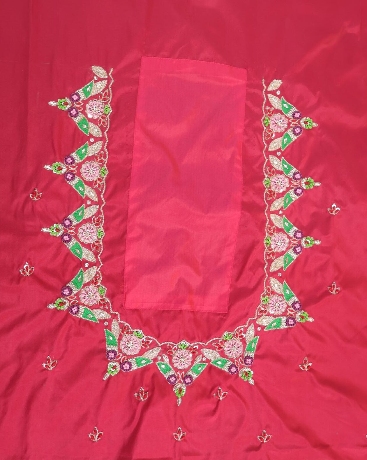 Unstitched 1 Meter Maggam Work Blouse Fabric with Round Neck Design. Crafted with intricate hand embroidery, perfect for creating a customized, rich festive or bridal blouse.