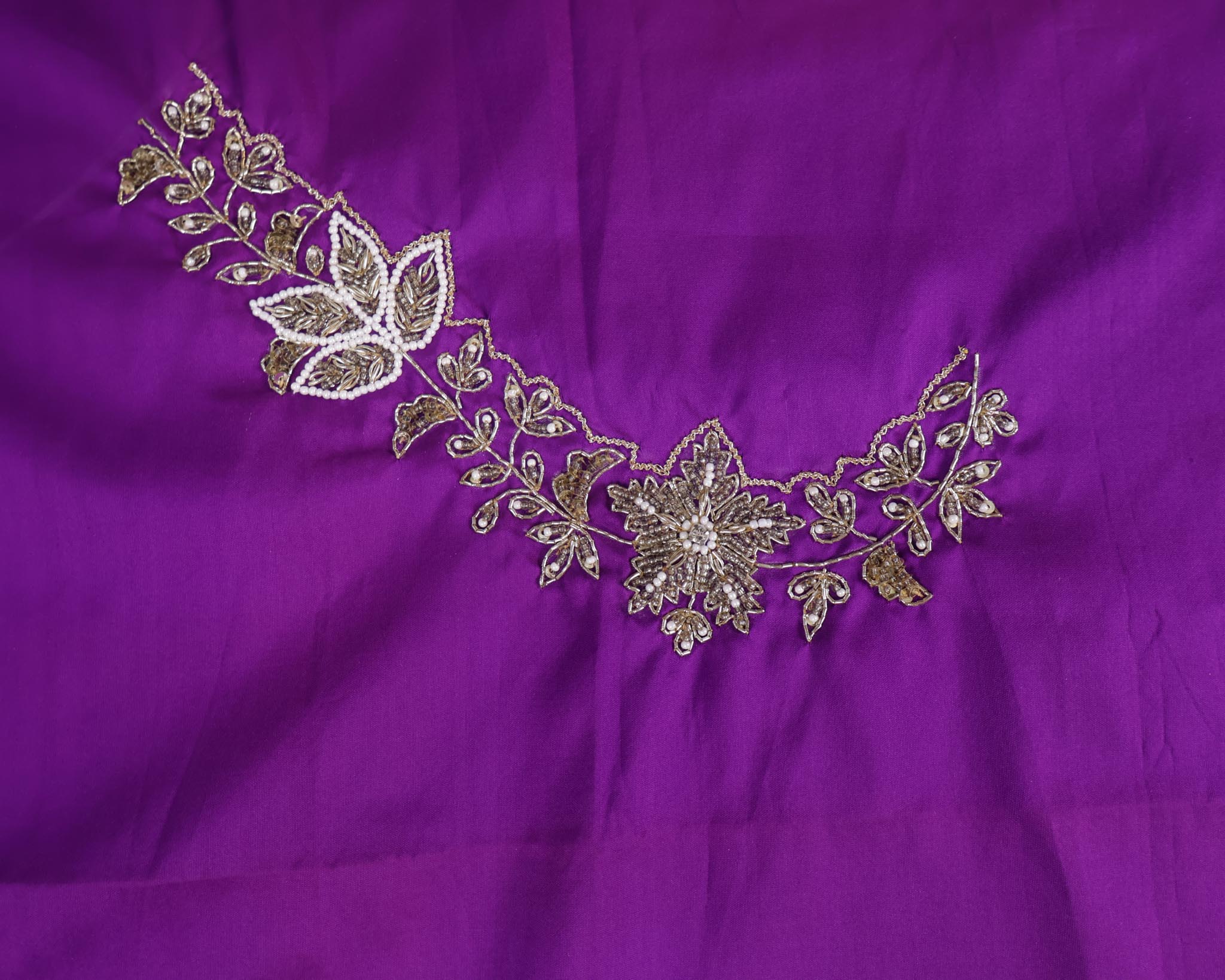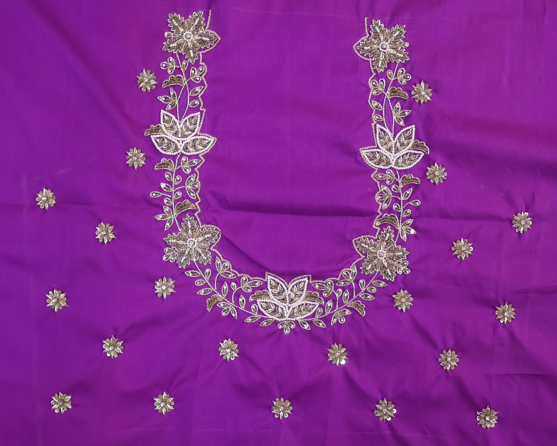 Premium 1 Meter Unstitched Maggam Work Blouse Fabric featuring detailed hand embroidery and a graceful round neck pattern. Ideal for stitching a stunning designer blouse for special occasions.